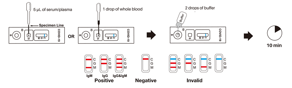 The COVID-19 IgG/IgM (Whole Blood/Serum/Plasma) Rapid Test Device utilizes lateral flow technology for the qualitative, differential detection of both anti-SARS-CoV-2 IgM and IgG antibodies. In general, antibodies can be detected 1-3 weeks after infection. This test is intended to screen patients for SARS-CoV-2 antibodies.